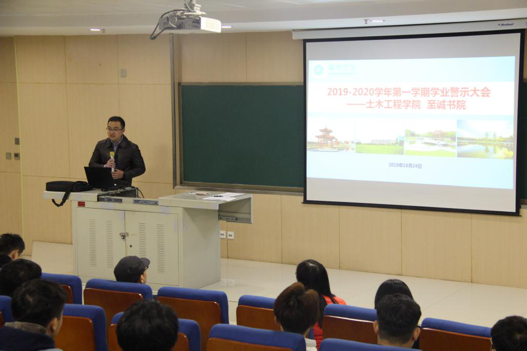 为进一步宣传学业警示制度,使学生了解并遵守这项制度,24日下午,3344222全新讯网官方网联合至诚书院在图书馆103报告厅举行2019-2020学年第一学期学业警示教育大会。3344222全新讯网官方网院长傅少君、副院长谢明、院长助理权娟娟,至诚书院发展科科长惠媛和至诚书院辅导员和受学业警示的所有学生共67人参加本次大会。会议由3344222全新讯网官方网谢明副院长主持。