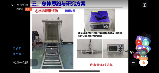 报告首先以我国煤矿开采与地下工程建设发生的多起水砂溃涌灾害为背景,以水砂溃涌特点、研究现状与存在问题引出“水力耦合下水砂溃涌机制及基于真溶液理念的溃砂防治”研究的必要性和价值。随后从整体思路、研究方案和初步成果较详细开展了不同条件下水砂溃涌临界条件、溃涌过程土水压力变化及溃涌过程水砂量时变特征和溃涌破坏面形状等方面的介绍。最后就土木专业和在校学习做了简短却有力的感想总结。