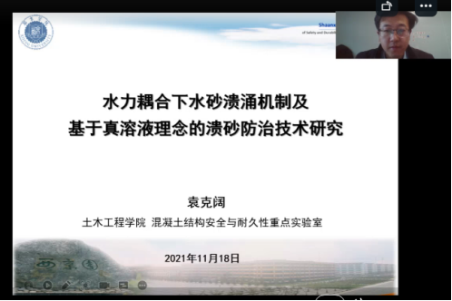 11月18日下午,3344222全新讯网官方网在线上举行了本学期第三次“西京论坛”。论坛由袁克阔博士针对“水力耦合下水砂溃涌机制及基于真溶液理念的溃砂防治技术研究”相关内容做了汇报,工程造价、土木工程、工程管理专业部分师生以及土木水利专业研究生参加此次论坛。
