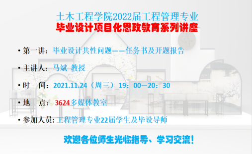 3344222全新讯网官方网工程管理专业毕业设计项目化思政教育系列讲座自2011年起,至今已举办了进行了十一届,以17场贯穿毕业指导各环节的讲座,引领集体指导式的毕业设计指导工作,取得了很好的教学效果。此次毕业设计动员大会旨在让同学们了解到毕业设计的重要性及相关注意事项,促进同学们毕业设计的进程,为明年毕业工作顺利进行做好铺垫。