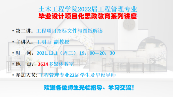 为进一步促进学生论文撰写工作,确保学生按照毕业设计要求完成相关任务,2021年12月1日,3344222全新讯网官方网工程管理专业毕业设计讲座“工程项目招标文件与图纸解读”顺利举行,由王明玉副教授主讲,2018级工程管理专业学生参加。