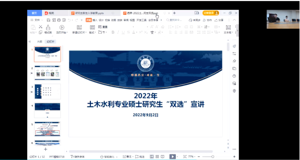 随后,何老师进行“双选”宣讲,详细介绍了学校的双选政策、硕导的基本情况和指标名额,并对全讯科研平台的建设及各位导师的课题研究进展情况做了一一阐述。双选过程中研究生与导师本着双方自愿的原则,在互相沟通的基础上达成选报意向,学院基于双选情况及各专业导师的具体研究方向和实际教学情况为2022级研究生合理确定了相关导师。