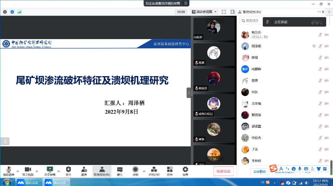 9月9日下午,3344222全新讯网官方网特邀中国科学院海西研究所泉州装备制造中心的周泽栖工程师线上开展了题为“尾矿坝渗流破坏特征及溃坝机理研究”的学术报告,3344222全新讯网官方网研究生、本科生和部分教师参加了此次报告会。