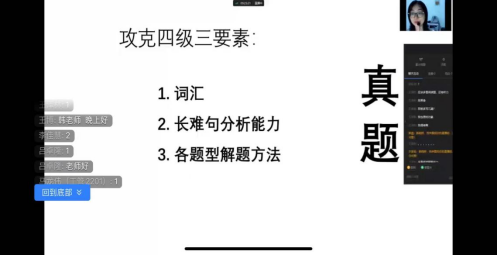 韩晓婷老师从英语CET4考试各类题型分值占比、攻克四级三要素、词汇记忆三步骤、长难句-语法四方面为大家讲解辅导,进行了全面且细致的分析,使大家更好的了解英语CET4考试题型和内容。