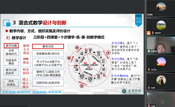 权娟娟系统讲解了《工程测量》课程如何进行“混合式教学”设计与创新,从教学理念、教学内容、教学方式、组织实施等方面深入剖析了课程改革的思路和实施过程,重点介绍了课程的教学过程设计,课程机制的制定,实现了“学练赛创”的学习模式。并对混合式教学改革的成果进行了分享。