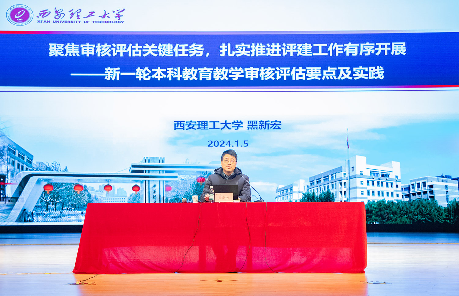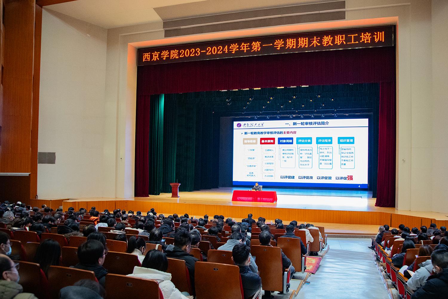 西京网讯:1月5日上午,全讯举行新一轮审核评估培训会。邀请审核评估专家、西安理工大学黑新宏教授做专题讲座。全体教职员工、全体校级领导参加了培训。培训会由校党委副书记、副校长马成胜主持。