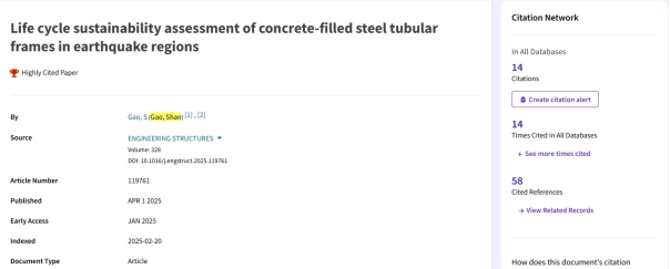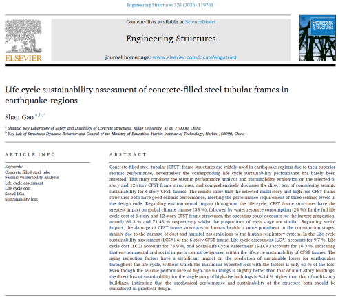 2025年1月在结构工程领域最具国际影响力的期刊《Engineering Structures》(中科院一区Top期刊,IF=6.5)发表的学术论文(中科院&JCR双一区Top期刊,IF=6.4)发表的学术论文《Life cycle sustainability assessment of concrete-filled steel tubular frames in earthquake regions》入选ESI高被引论文。论文对选定的6层和12层钢管混凝土框架结构进行了抗震性能分析和可持续性评估,并全面探讨了考虑6层钢管混凝土框架抗震可持续性的直接损失。本研究将为钢管混凝土结构在需要高性能结构体系的地震区域的应用提供参考,以减少其能耗、材料及碳排放量,进而推动建筑行业的可持续发展。
